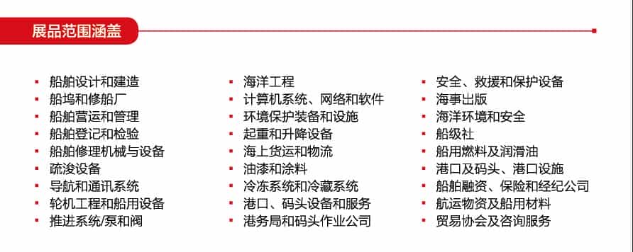 關(guān)鍵字延伸:船舶設(shè)計和建造、船塢和修船廠、船舶營運和管理、船舶登記和檢驗、船舶修理機械與設(shè)備、疏浚設(shè)備、導(dǎo)航和通訊系統(tǒng)、輪機工程和船用設(shè)備、推進系統(tǒng)/泵和閥、海洋工程、計算機系統(tǒng)、網(wǎng)絡(luò)和軟件、環(huán)境保護裝備和設(shè)施、起重和升降設(shè)備、海上貨運和物流、油漆和涂料、冷凍系統(tǒng)和冷藏系統(tǒng)、港口,碼頭設(shè)備和服務(wù)、港務(wù)局和碼頭作業(yè)公司、安全,救援和保護設(shè)備、海事出版、海洋環(huán)境和安全、船級社、船用燃料及潤滑油、港口及碼頭,港口設(shè)備、船舶融資、保險和經(jīng)紀公司、船運物資及船用材料、貿(mào)易協(xié)會及咨詢服務(wù)