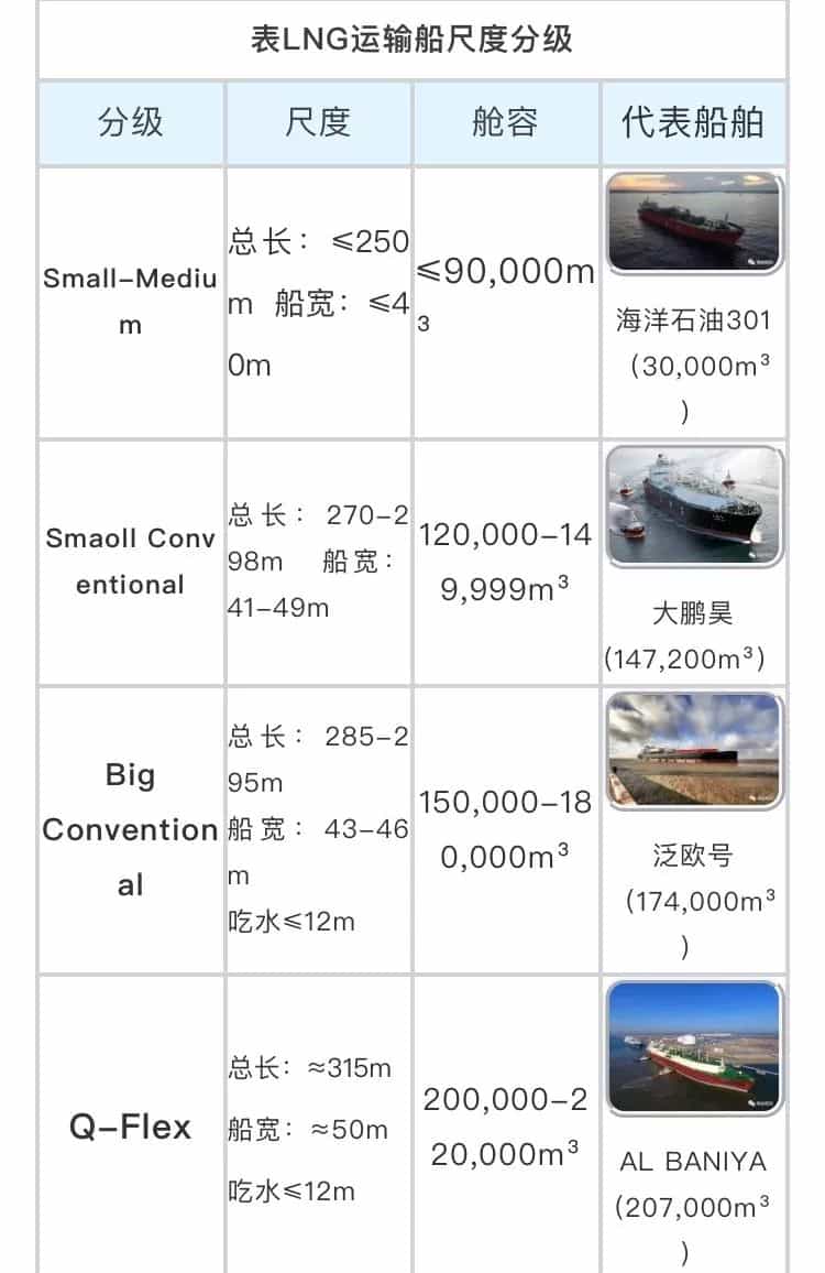 大部分商船如散貨船、油船都以載重噸計量船舶尺度,而LNG因低密度的特性(約為水的密度的一半),LNG運輸船則以載貨艙容立方米為單位計量船舶尺度。隨著造船技術(shù)的進步和船東對規(guī)模效益的追求,現(xiàn)代商船的發(fā)展歷程總體呈大型化趨勢,LNG運輸船也不例外。