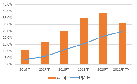 此外,市場(chǎng)向綠色船舶傾斜的速度加快,以雙燃料動(dòng)力為主的環(huán)保船舶占新承接訂單比例不斷升高。以成交的艘數(shù)計(jì),2016年僅占新船訂單的3.9%,而2020年就已升到21.3%,到今年年中占比進(jìn)一步擴(kuò)大,接近四分之一(24.9%);以修正總噸計(jì),2020年環(huán)保船舶占總訂單的比例接近38.9%。