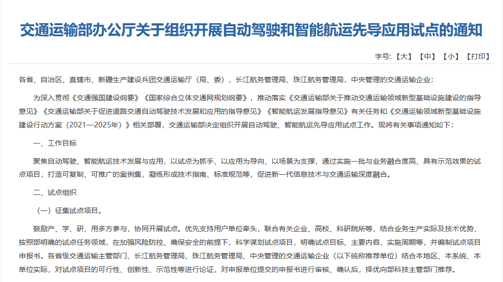 日前,交通運輸部發(fā)布關于組織開展自動駕駛和智能航運先導應用試點的通知,聚焦自動駕駛、智能航運技術發(fā)展與應用,以試點為抓手、以應用為導向、以場景為支撐,通過實施一批具有示范效應的試點項目,打造可復制、可推廣的案例集,凝練形成技術指南、標準規(guī)范等,促進新一代信息技術與交通運輸深度融合。