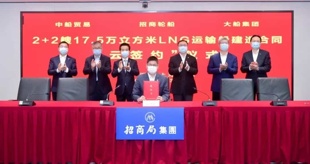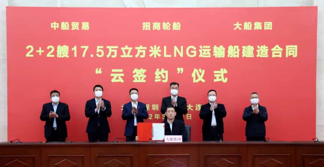 3月31日,中國船舶集團(tuán)有限公司旗下大連船舶重工集團(tuán)有限公司聯(lián)合中國船舶工業(yè)貿(mào)易有限公司,與招商局集團(tuán)有限公司旗下招商局能源運(yùn)輸股份有限公司在上海、深圳、大連及北京四地以“云簽約”方式正式簽署2+2艘17.5萬立方米大型液化天然氣(LNG)運(yùn)輸船建造合同。