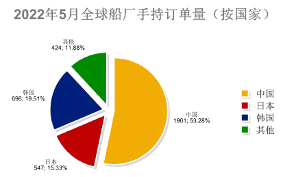 其中中國船廠手持訂單量為1901艘,艘數(shù)占全球市場份額的53.28%;日本船廠的手持訂單量為547艘,艘數(shù)占全球市場份額的15.33%;韓國船廠的手持訂單量為696艘,艘數(shù)占全球市場份額的19.51%。