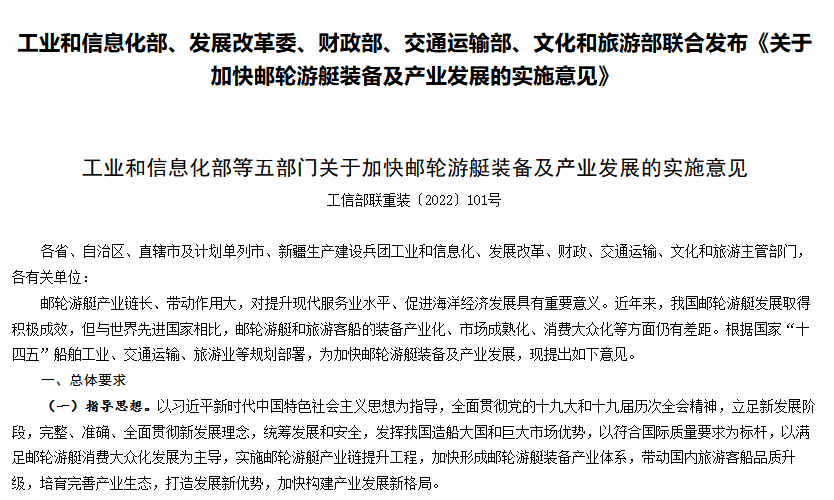 8月18日,工業(yè)和信息化部、國家發(fā)展和改革委員會、財政部、交通運輸部、文化和旅游部聯(lián)合發(fā)布《關(guān)于加快郵輪游艇裝備及產(chǎn)業(yè)發(fā)展的實施意見》(簡稱實施意見)。