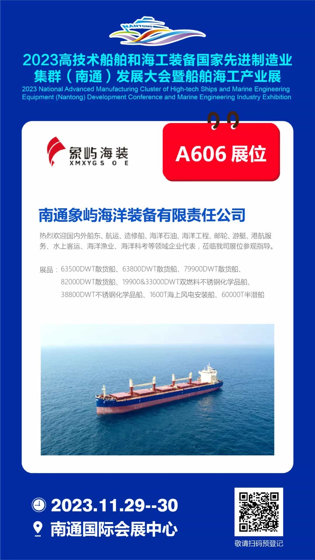 2023年11月29-30日,南通國際會(huì)展中心A606展位,象嶼海裝與全球船舶人相約南通,走進(jìn)世界級(jí)船舶海工先進(jìn)制造業(yè)集群!