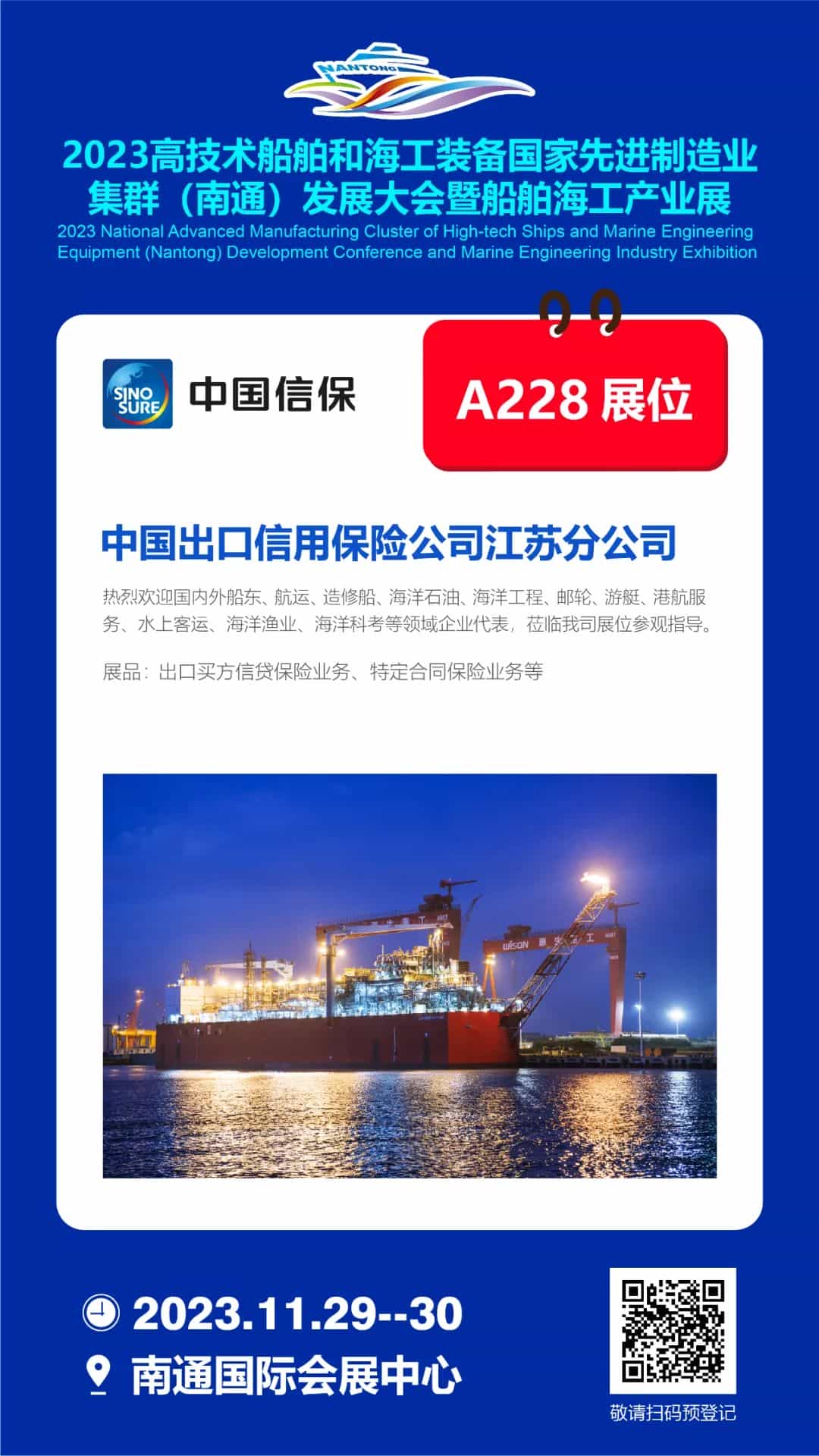 2023年11月29-30日,歡迎船舶人蒞臨南通國際會展中心A228展位,與中國信保攜手合作,逐夢海洋!