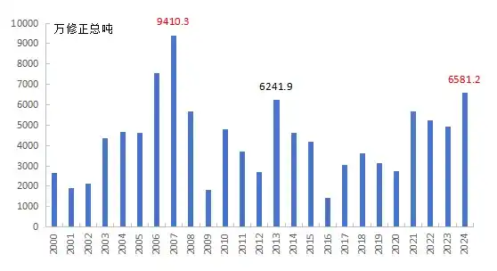 以修正總噸計(jì),2024年全球新船訂單量已超過2013年的6241.9萬修正總噸,創(chuàng)2008年以來的新高。
